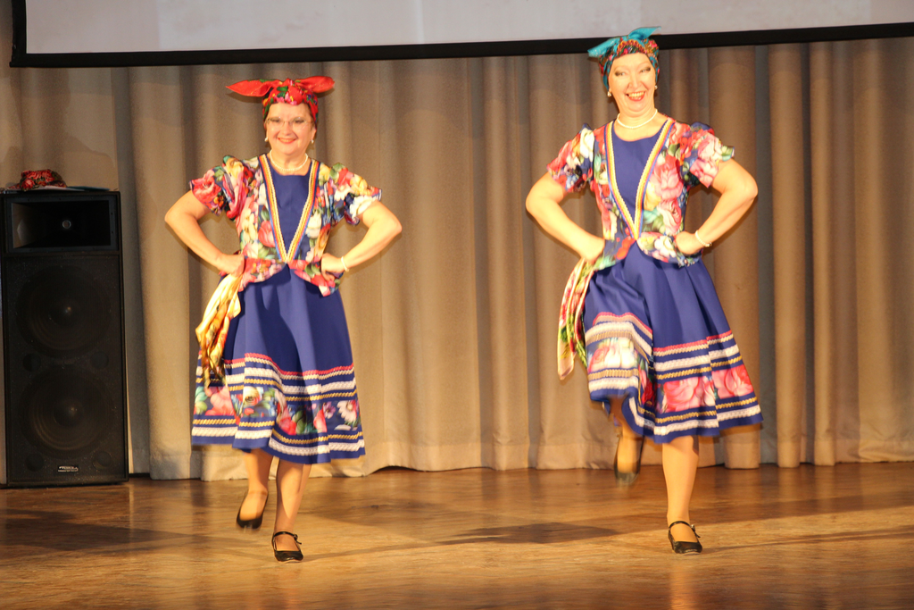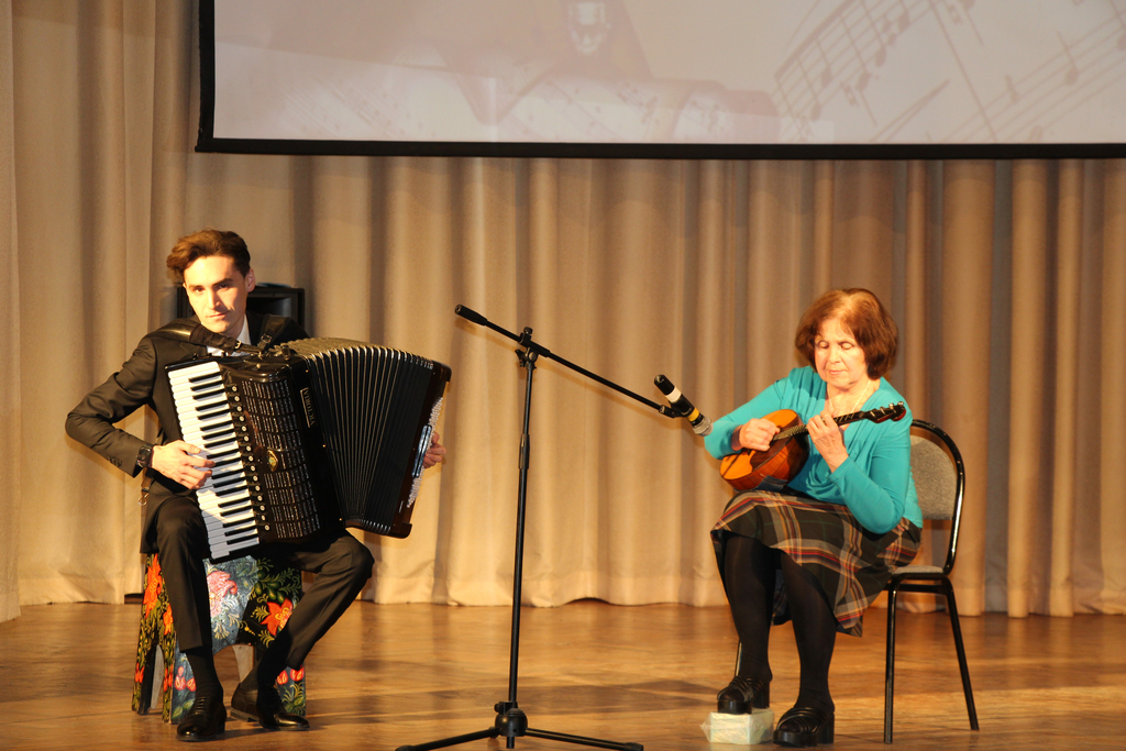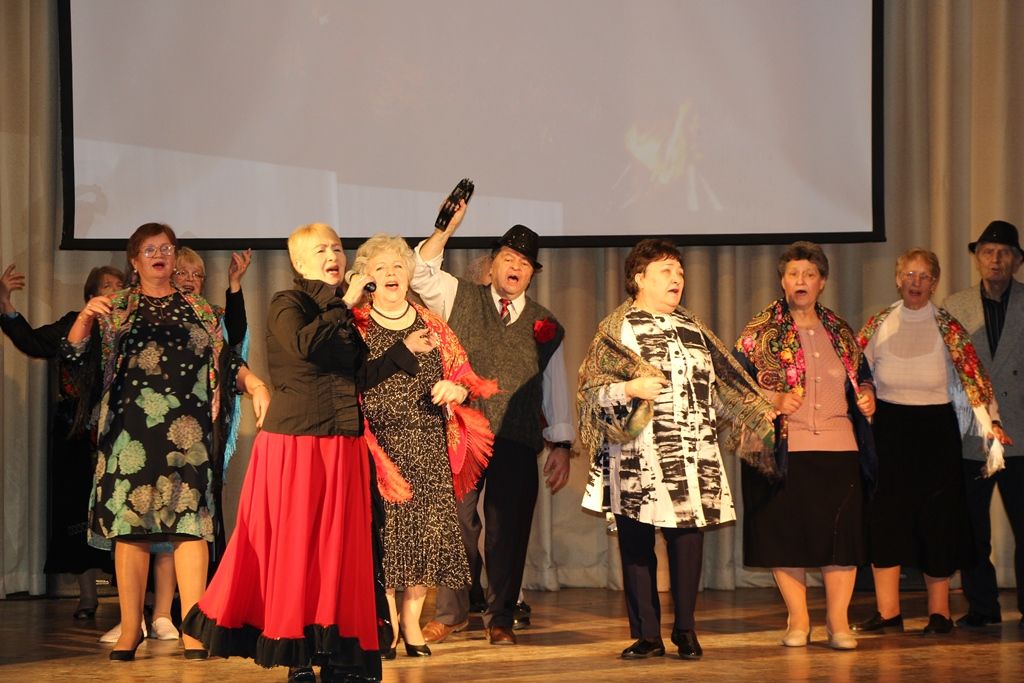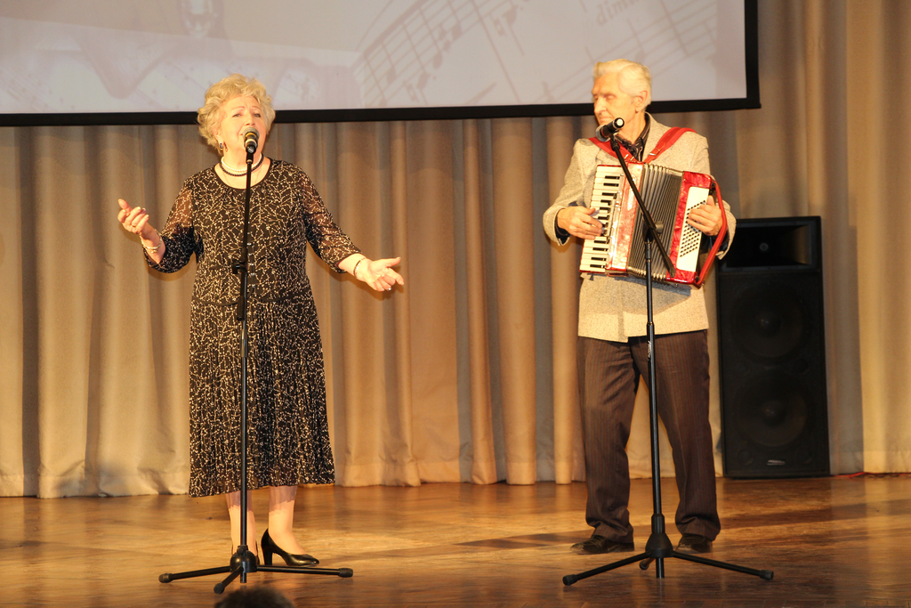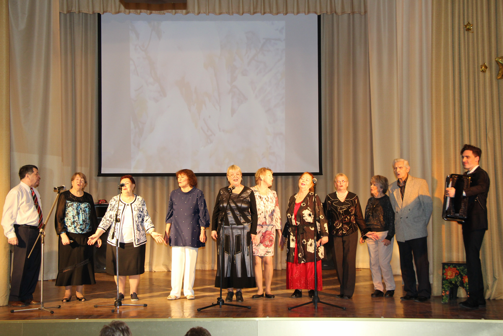 В исполнении вокальной группы прозвучали веселые, зажигательные песни: «Ой, снег – снежок», «Коробейники», а также лирическая, проникновенно- исполненная песня «Зимняя любовь». Очень порадовало зрителей выразительное выступление ветеранов педагогического труда Татьяны Черных и Олега Серегина с песней «Кнопочки баянные».