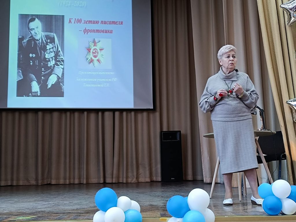 В ходе выступления и презентации были показаны отрывки из фильмов, сценарии к которым были написаны Юрием Васильевичем Бондаревым, звучали песни военных лет, зачитывались высказывания писателя о нашем непростом времени. Интересно было узнать не только об участии писателя на войне, о его заслугах и наградах, о его общественной и творческой деятельности, но и о его твердой, несгибаемой жизненной позиции во все периоды нашей страны. Год столетия со дня рождения выдающегося писателя – это весомый повод поразмышлять о нем как о незаурядной личности, гражданине, истинном патриоте, мыслителе. Многим слушателям после вечера захотелось снова перечитать и осмыслить произведения замечательного писателя.