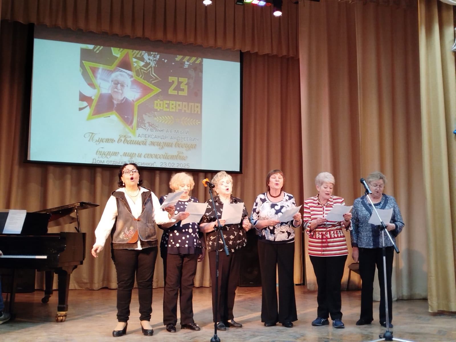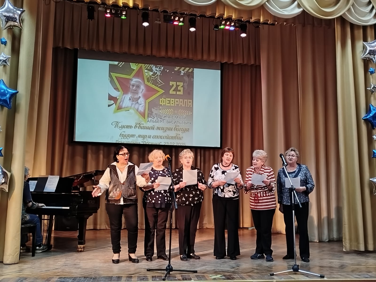 Программа началась с поздравления мужчин и вручением им небольших сувениров. Светлана Ковалёва исполнила для них песню «Bésame mucho», а вокальная группа переделанные песни «Однажды вечером» и «Ежедневно меняется мода». Песни звучали тепло и душевно, вызывая улыбки и аплодисменты собравшихся. Каждый куплет был наполнен благодарностью и уважением к мужчинам.